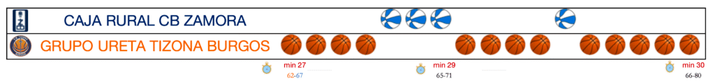 Tras el descanso otro mate zamorano, con Jacob Round remontando la línea de fondo reducía la brecha (48-50), pero los visitantes más acertados que los zamoranos, empezaban a tomar ventajas significativas, Ty Roberts volvía a reducir distancias (55-56) antes del 0-9 burgalés que alcanzaba la barrera de los diez puntos de distancia. Con medio cuarto por disputar el ritmo del encuentro lo marcaba Grupo Ureta Tizona Burgos y los blaquiazules luchaban por no descolgarse en el marcador (62-67 a 3:25 del final del cuarto). Una vez más otro “arreón” burgalés les daba la máxima ventaja del partido al finalizar el tercer periodo (66-80).