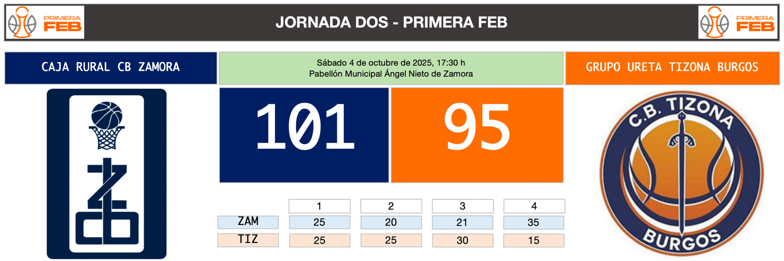 Partido correspondiente a la segunda jornada de la Primera FEB, disputado el sábado 4 de octubre de 2025 en el Pabellón Municipal Ángel Nieto de Zamora ante unos 1.200 espectadores, dirigido por el trío arbitral formado por Fernando Ibáñez García (Castilla-La Mancha), Jordi Domingo Vilalta (Cataluña) y Alejandro López Lecuona (País Vasco). Sin expulsados.