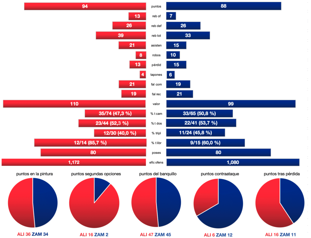 HLA ALICANTE (27+22+21+24) 94: Jean Mema (2), Kevin Larsen (27), Jordan Walker (10), Deng Geu (8), Sergio Llorente -quinteto inicial- Unai Mendícote (14), Sebastian Aris, Boubacar Coulibaly (2), Ismael Tamba (6), Tucker Richardson (11) y Alejandro Jordá (14). Entrenador Rubén Perelló Paricio.