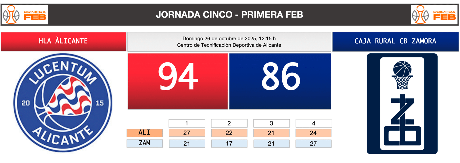 Partido correspondiente a la quinta jornada de Primera FEB, disputado el domingo 26 de octubre de 2025 a las 12:15 horas en el Centro de Tecnificación Deportiva de Alicante, dirigido por el trío arbitral formado por Juan Pedro Morales García-Alcaide (Comunidad de Madrid), María de los Ángeles García Crespo (Andalucía) y Nicolás Murillo Khon (Canarias). Sin expulsados.