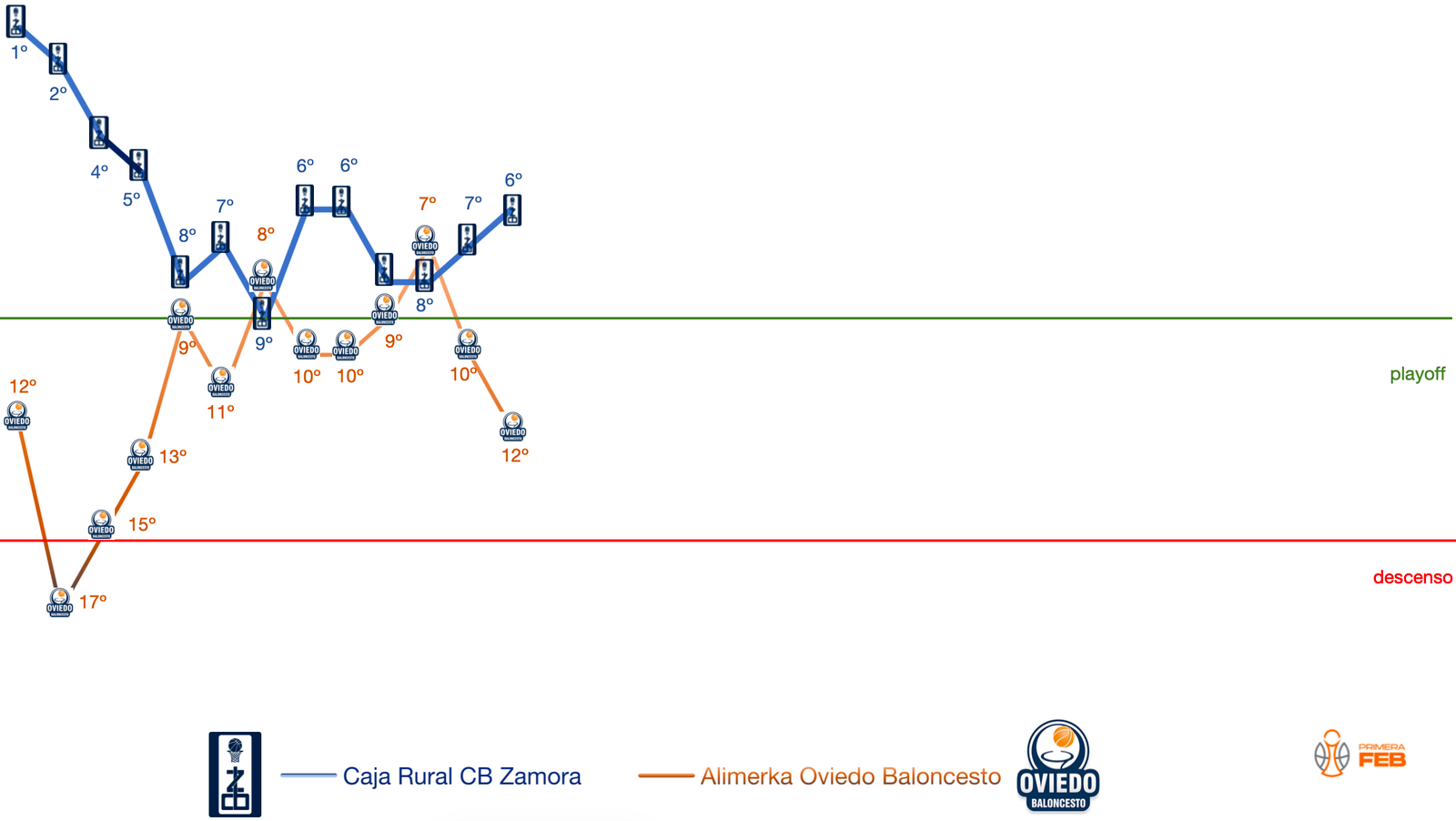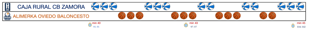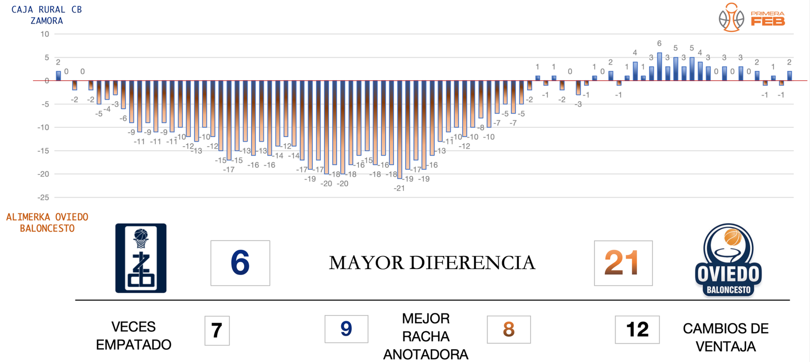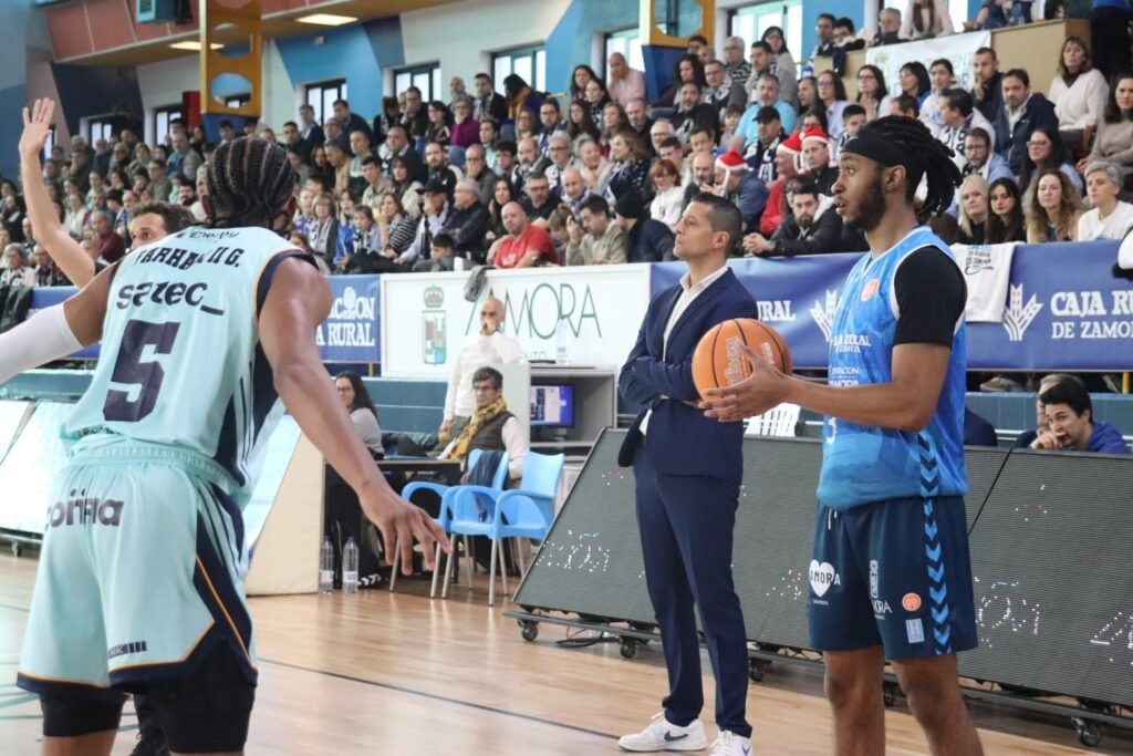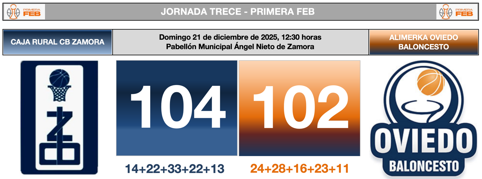 Partido correspondiente a la decimotercera jornada de la Primera FEB disputado el domingo 21 de diciembre de 2025 a las 12:30 horas, en el Pabell贸n Municipal 脕ngel Nieto de Zamora, dirigido por el tr铆o arbitral formado por Juan Pedro Morales Garc铆a-Alcaide (Comunidad de Madrid), Jorge Caama帽o Mu帽oz (Pa铆s Vasco) y Joan Fan茅s Marginet (Catalu帽a), Marques Townes y Gregory Parham II del Alimerka Oviedo Baloncesto fueron expulsados por acumulaci贸n de faltas.