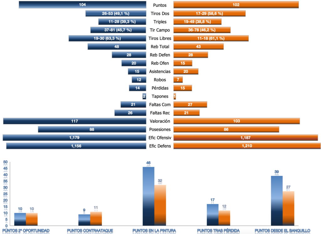 33:11 minutos, 28 puntos, 6 triples con 46,2 % de acierto, 5 rebotes, 1 asistencia, 4 robos, 24 de valoraci贸n y +10 para su equipo con 茅l en pista