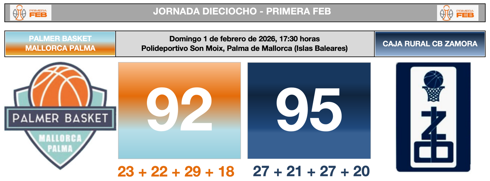Partido correspondiente a la decimoctava jornada de la Primera FEB disputado el domingo 1 de febrero de 2026 a las 17:30 horas, en el Polideportivo de Son Moix de Palma de Mallorca (Islas Baleares), dirigido por el trío arbitral formado por Enrique López Herrada, Alejandro Aranzana García y Marc García Santos, sin expulsados.