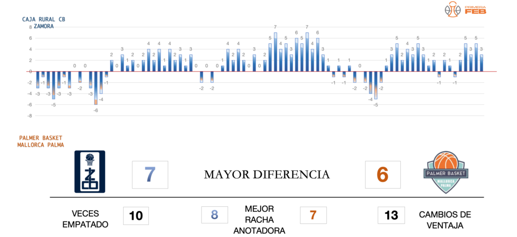 Los primeros minutos del encuentro discurrieron con pequeñas ventajas locales hasta que Ty Roberts con 5 puntos consecutivos logró el primer empate del partido (9-9). Dos triples locales abrían la máxima ventaja balear con seis puntos de brecha (17-11), pero una vez más Caja Rural CB Zamora devolvía los golpes y lograba ponerse por delante gracias a un triple del capitán visitante Jacob Round (17-19). El marcador continuaba igualado hasta que un 0-4 en el último minuto del primer cuarto daba una pequeña ventaja a los castellanoleoneses (23-27).