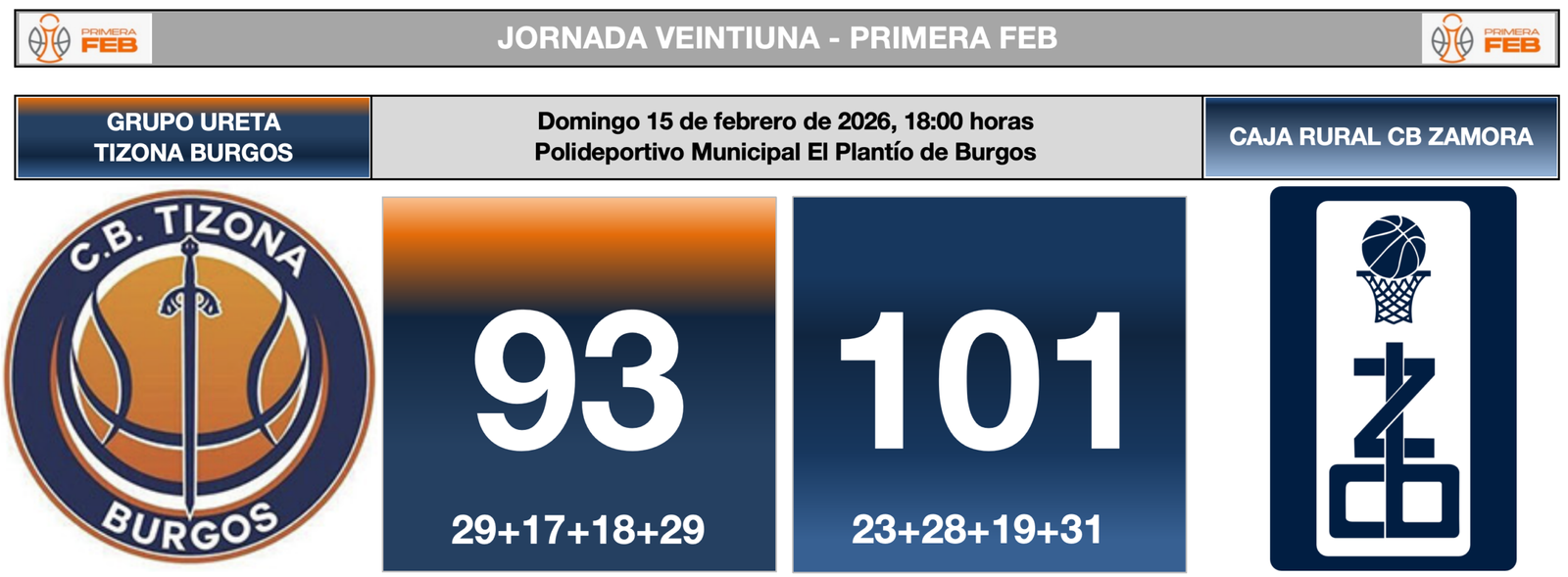 Partido correspondiente a la vigesimoprimera jornada de la Primera FEB disputado el domingo 15 de febrero de 2026 a las 18:00 horas, en el Polideportivo Municipal El Plantío de Burgos ante 1.982 espectadores, dirigido por el trío arbitral formado por Jacobo Rial Barreiro (Galicia), Francisco González Cuervo (Castilla y León) y Sergio Acevedo Perera (Extremadura), Javonte Brown del Grupo Ureta Tizona Burgos fue expulsado por acumulación de faltas.
