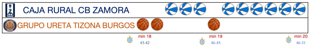 El segundo periodo los jugadores de Saulo Hernández fueron recortando la distancia poco a poco, liderados por Álvaro Martínez y Jonas Paukštė, colocándose a un punto de distancia en el ecuador del cuarto (38-37). Un parcial de 1-9 en los dos últimos minutos de la primera parte, daba la primera ventaja a Caja Rural CB Zamora desde el primer cuarto (46-51).