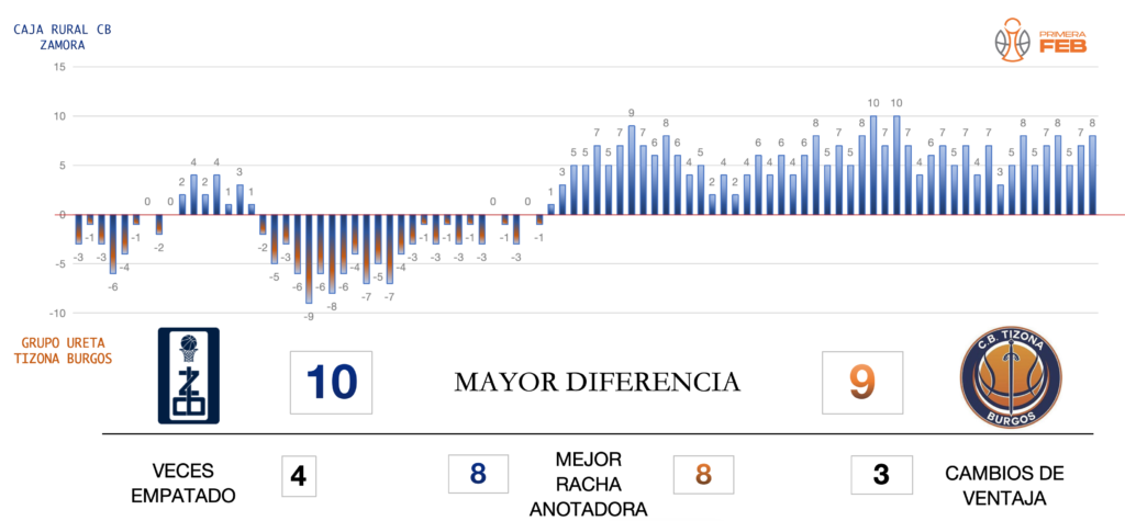 El inicio de los burgaleses fue muy efectivo desde el triple, al minuto de juego dominaban 8-2, pero Caja Rural CB Zamora con un parcial de 2-12 devolvía el golpe y se colocaba arriba (10-14). Los locales apoyados en su tiro de tres salían del bache anotador y se colocaban nueve arriba (29-20), recortando Colby Rogers con un lanzamiento desde el 6,75 en los últimos instantes del cuarto (29-23).
