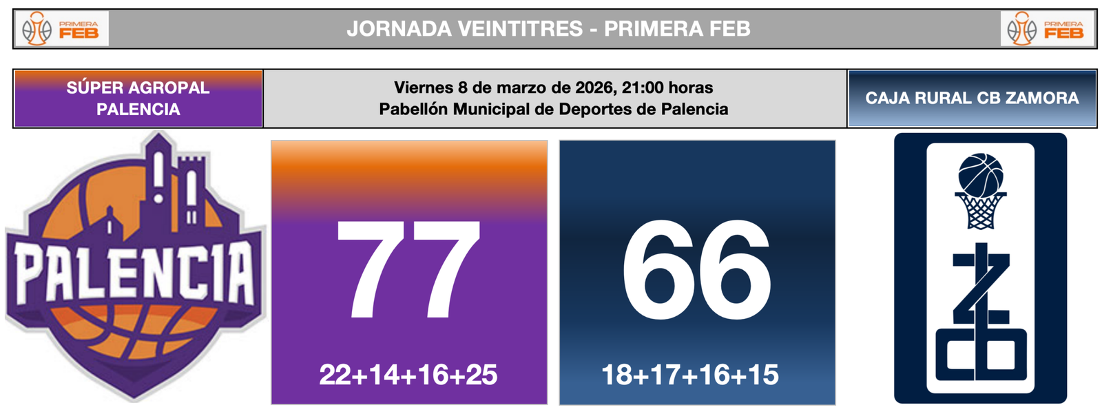 Partido correspondiente a la vigesimotercera jornada de la Primera FEB disputado el viernes 6 de marzo de 2026 a las 21:00 horas, en el Pabellón Municipal de Deportes de Palencia ante 5.000 espectadores, dirigido por el trío arbitral formado por Juan Ramón Hurtado Almansa (Melilla), Cristian Martín Vázquez (Galicia) y José Carlos Sierra Carrillo (Andalucía), sin expulsados.