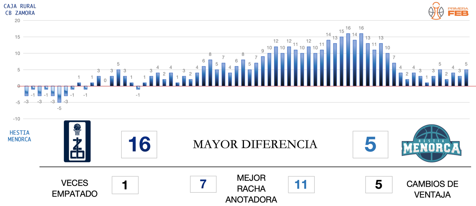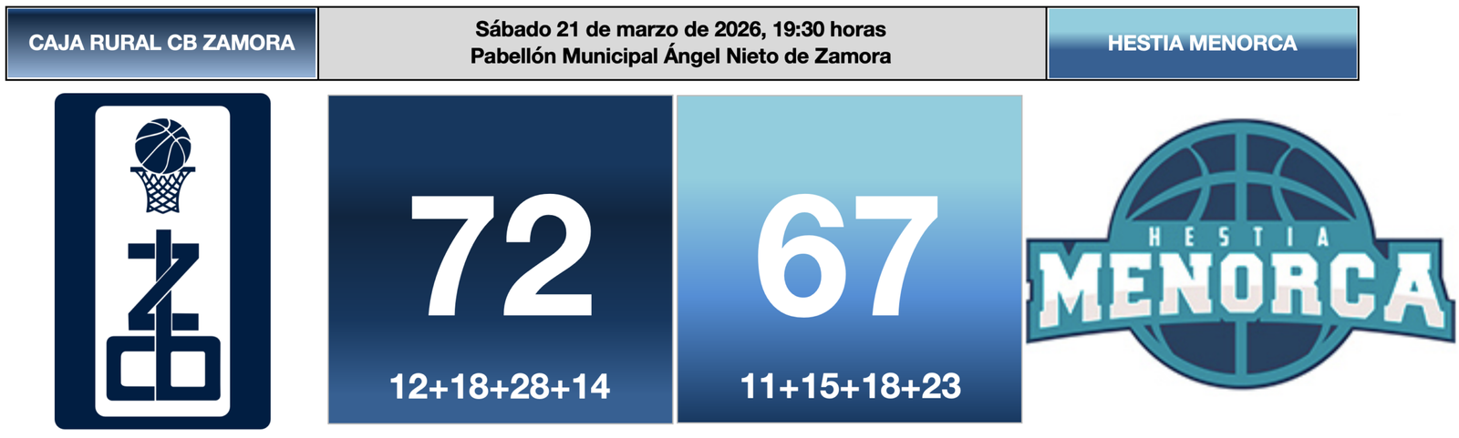 Partido correspondiente a la vigesimosexta jornada de la Primera FEB disputado el s谩bado 21 de marzo de 2026 a las 19:30 horas en el Pabell贸n Municipal 脕ngel Nieto de Zamora, dirigido por el tr铆o arbitral formado por Francisco Jos茅 Zafra Guerra (Comunidad Valenciana), Juan Gabriel Carpallo Migu茅lez (Castilla y Le贸n) y Laura Pi帽eiro Amondaray (Galicia), Jaume Lobo del Hestia Menorca fue expulsado por acumulaci贸n de faltas.