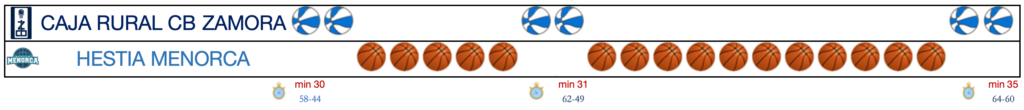 Caja Rural CB Zamora acert贸 en el 6,7聽% de sus lanzamientos de tres, un 煤nico triple, mientras que Hestia Menorca logr贸 el 22,9聽%