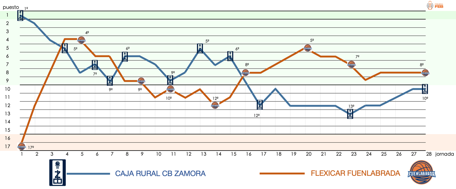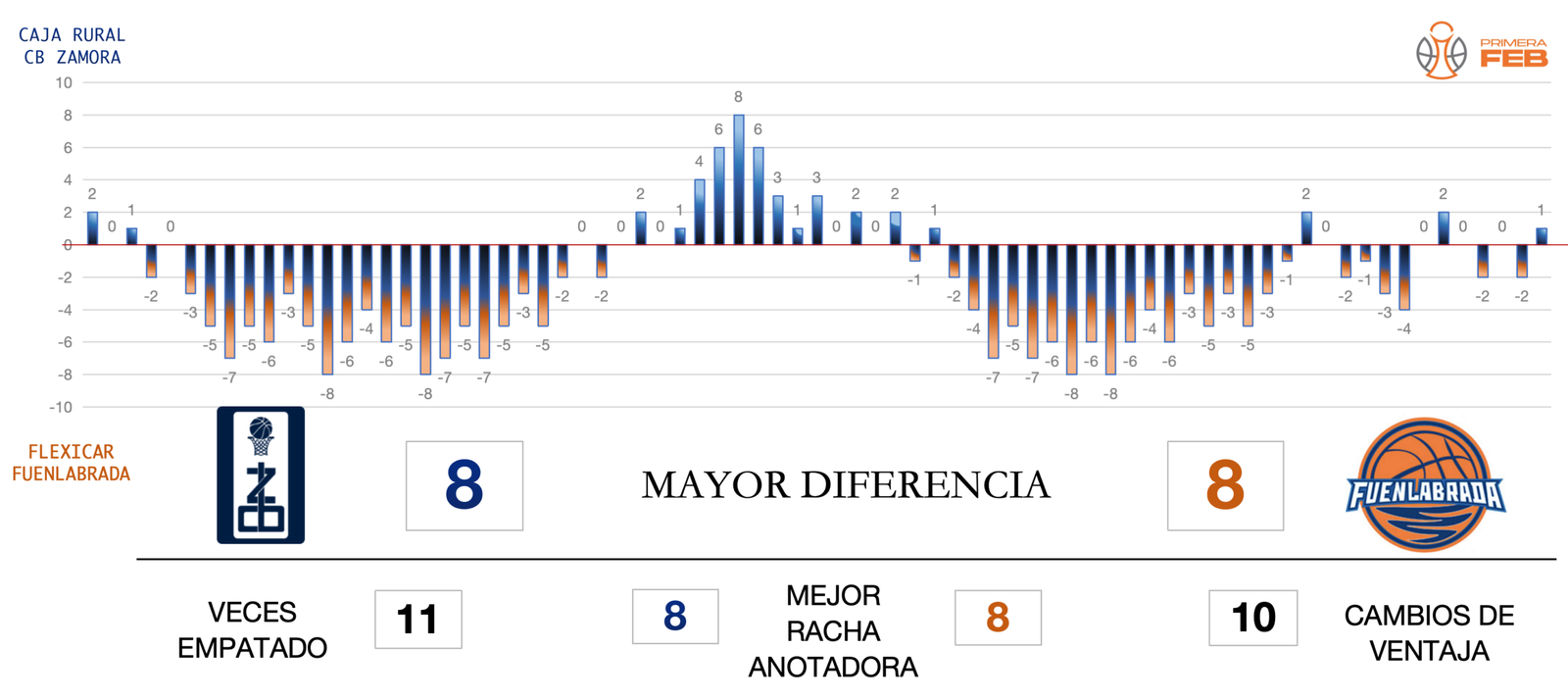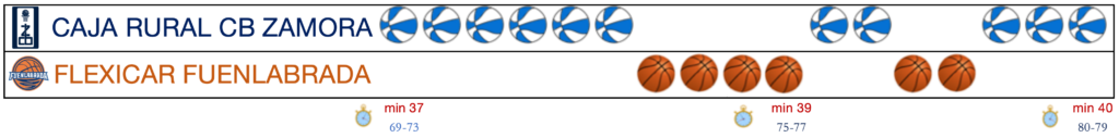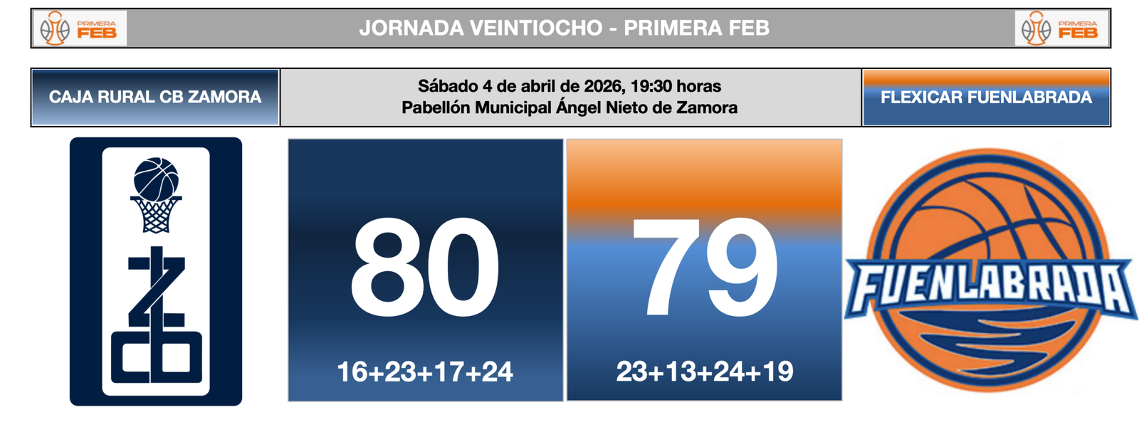 Encuentro disputado este sábado 4 de abril correspondiente a la vigesimoctava jornada de la Primera FEB, entre Caja Rural CB Zamora (10º) y Flexicar Fuenlabrada (8º), ambos conjuntos ganaron la semana anterior, los locales en su salida a Galicia y los fuenlabreños llegaban al Ángel Nieto después de su contundente victoria de la pasada semana ante Palmer Basket Mallorca Palma (87-67).
