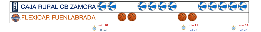 La igualdad de los minutos iniciales (5-5) la rompían los visitantes con un parcial de 0-7, consiguiendo una ventaja que arrastraron el resto del primer cuarto. La máxima ventaja del partido para Flexicar Fuenlabrada se fijaba en los ocho puntos (10-18) y aunque Caja Rural CB Zamora dejaba atrás sus peores momentos ofensivos, varios tiros libres errados impidieron que terminaran los primeros diez minutos más cerca de lo que reflejaba el luminoso del Ángel Nieto (16-23), con siete puntos de desventaja.