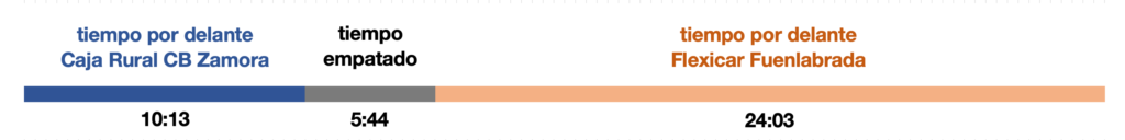 El tercer cuarto recordaba el inicio del encuentro, con el marcador igualado en los primeros minutos (47-46, minuto 24), pero con Flexicar Fuenlabrada apretando el acelerador abriendo la brecha en la segunda parte del cuarto (47-54). Joey van Zegeren y Álvaro Martínez recortaban distancias justo antes de los últimos diez minutos y Caja Rural CB Zamora se acercaba a cuatro puntos (56-60).
